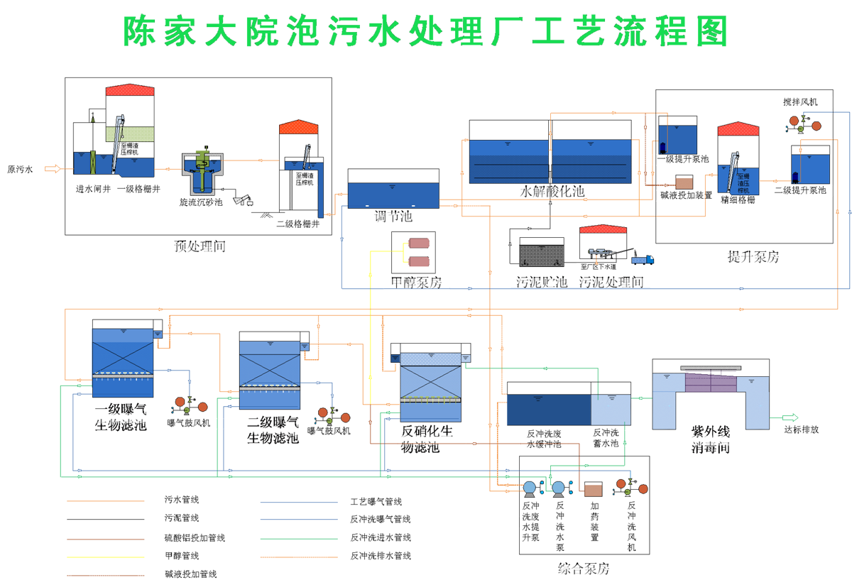 該污水處理廠主體工藝由預處理間、調節池、提升泵房、水解酸化池、一級曝氣生物濾池、二級曝氣生物濾池和反硝化生物濾池、紫外線消毒間等構筑物組成。其中曝氣生物濾池采用我公司專利技術“后置反硝化脫氮工藝”。出水水質可達到國家《城鎮污水處理廠污染物排放標準》(GB18918-2002)中的一級A類標準。
