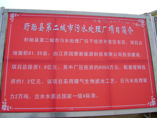 盱眙縣第二城市污水處理廠位于盱眙經濟開發區內,為BOT項目,設計規模為4萬噸/日,分兩期建設,一期工程2萬噸/日。