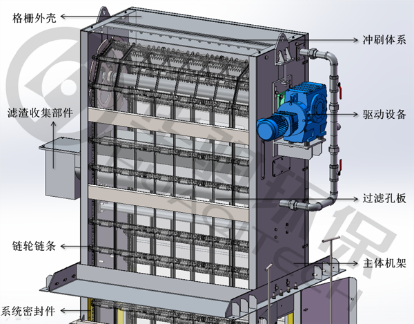 SupFTM產(chǎn)品結(jié)構(gòu):主要由驅(qū)動設(shè)備、主體機(jī)架、外殼、鏈輪鏈條、過濾孔板、沖刷體系、系統(tǒng)密封件、濾渣收集部件、及電氣控制柜等部件構(gòu)成。