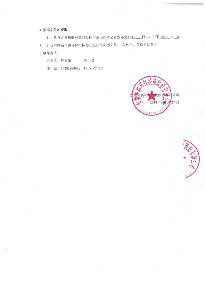 4.1 凡符合資格的有意向投標申請人在本公告發布之日起 五 日內,可于 2022 年 10 月 31 日前聯系華騏環保招標辦公室獲取招標文件。(公休日、節假日除外)