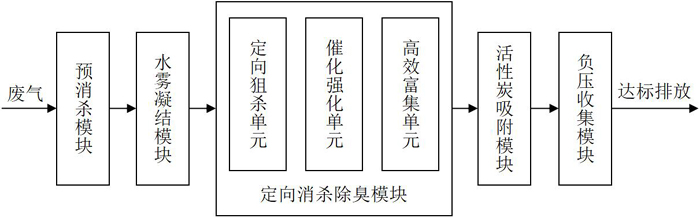 ④ 病毒富集、定向消殺、除臭過程:除濕后的廢氣進入定向消殺除臭模塊,病毒被定向狙擊消殺,惡臭被分解消除。具體地: